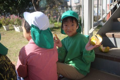 園庭の柿の木に実が成り「柿」を食べました。