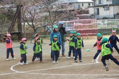 年長さんは「リレー」の練習をしました。どちらのクラスもいい勝負をしております。